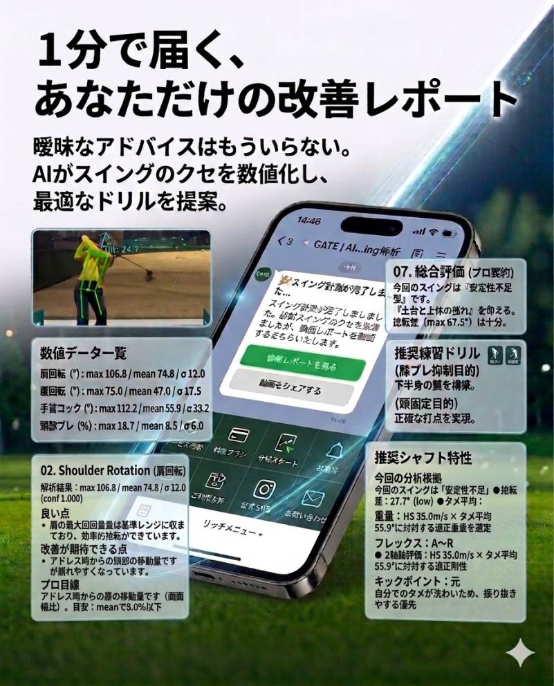 AIが全身33か所の動きを捉え、GATE独自の理論で解析。肩や腰の回転、軸の安定性など、上達に不可欠な5つの重要指標を数値化します。